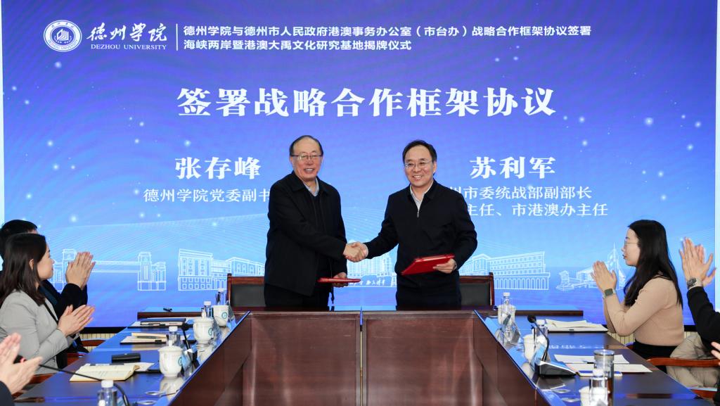 张存峰与苏利军代表双方签署《德州学院与德州市人民政府港澳事务办公室(市台办)战略合作框架协议》。