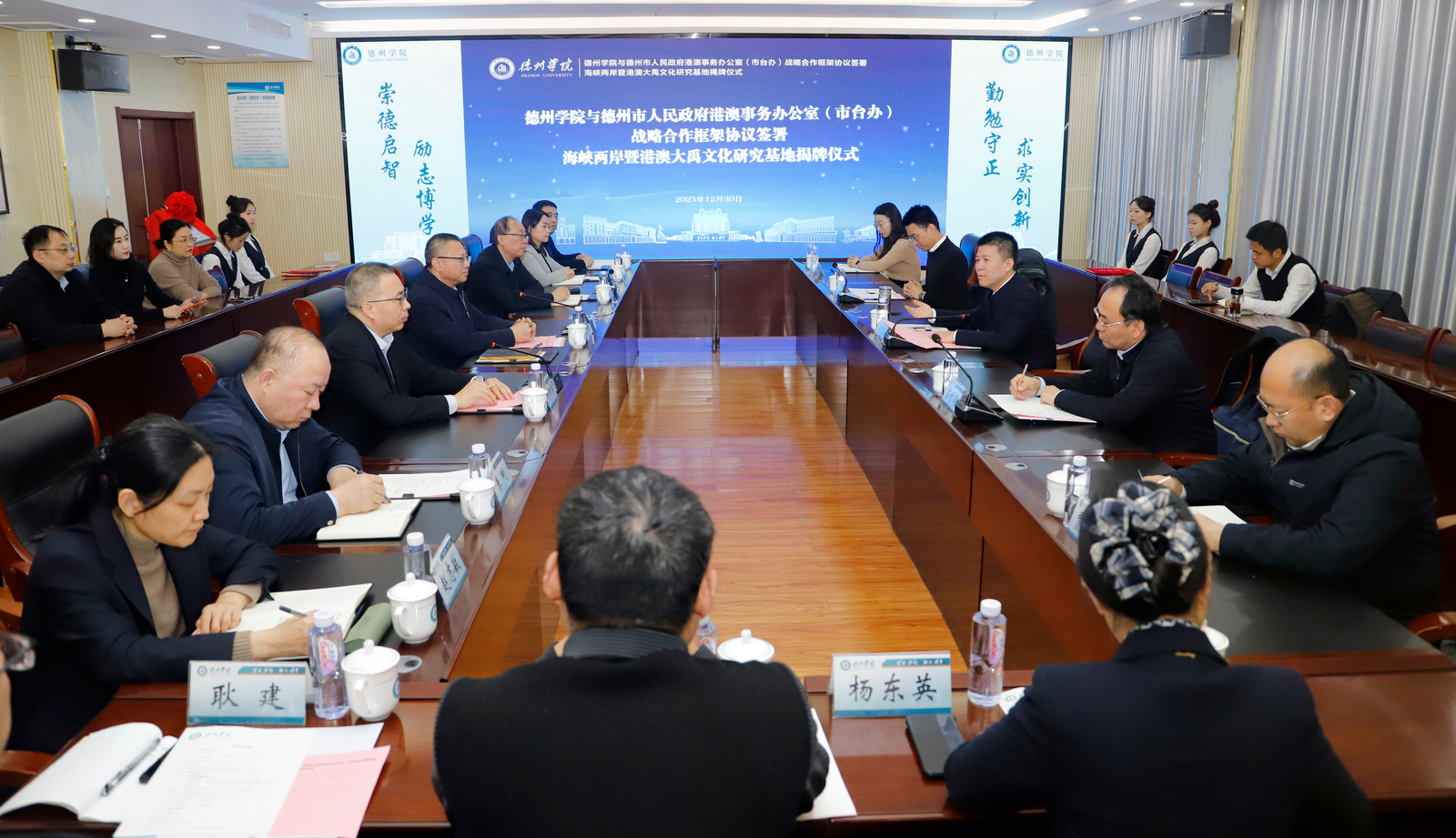 12月30日下午,我校与德州市人民政府港澳事务办公室(市台办)战略合作框架协议签署仪式暨“海峡两岸暨港澳大禹文化研究基地”揭牌仪式在厚德楼二楼报告厅举行。德州市委常委、统战部部长,德州高新区党工委书记、管委会主任张志华,市委统战部副部长、市台办主任、市港澳办主任苏利军,校党委书记吴君、党委副书记张存峰、党委委员、副校长刘印房出席仪式。仪式由刘印房主持。