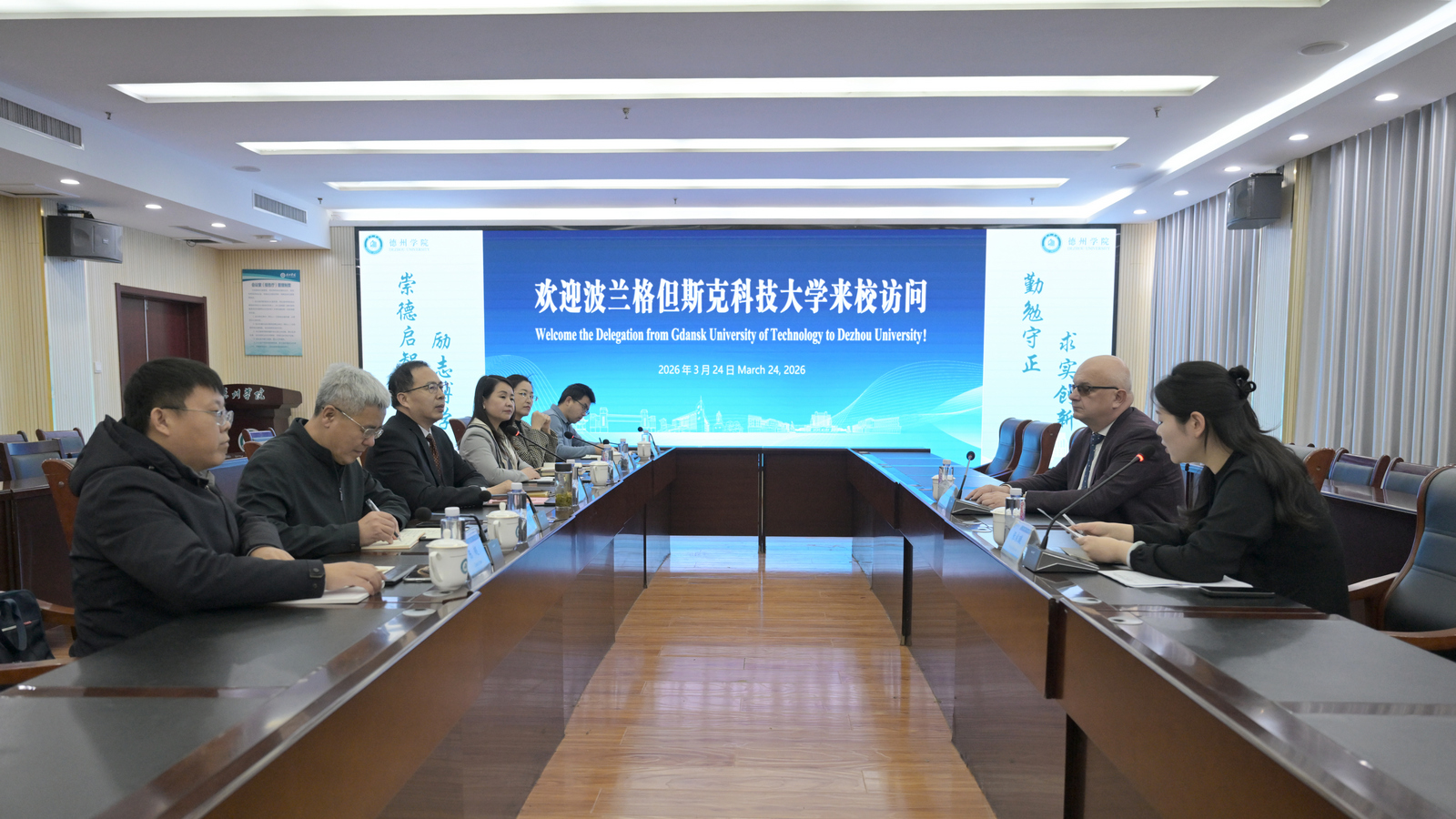 达留什・米克莱维兹在讲话中对我校的热情接待表示感谢,对两校多年来的合作成果给予高度肯定。他表示,格但斯克科技大学高度重视与德州学院的合作,愿与德州学院携手并肩,围绕中外合作办学项目可持续发展等核心事宜加强沟通、凝聚共识,不断优化人才培养方案、完善英语强化教学体系,推动双方在人才培养、学术交流等领域的合作取得更多务实成果。